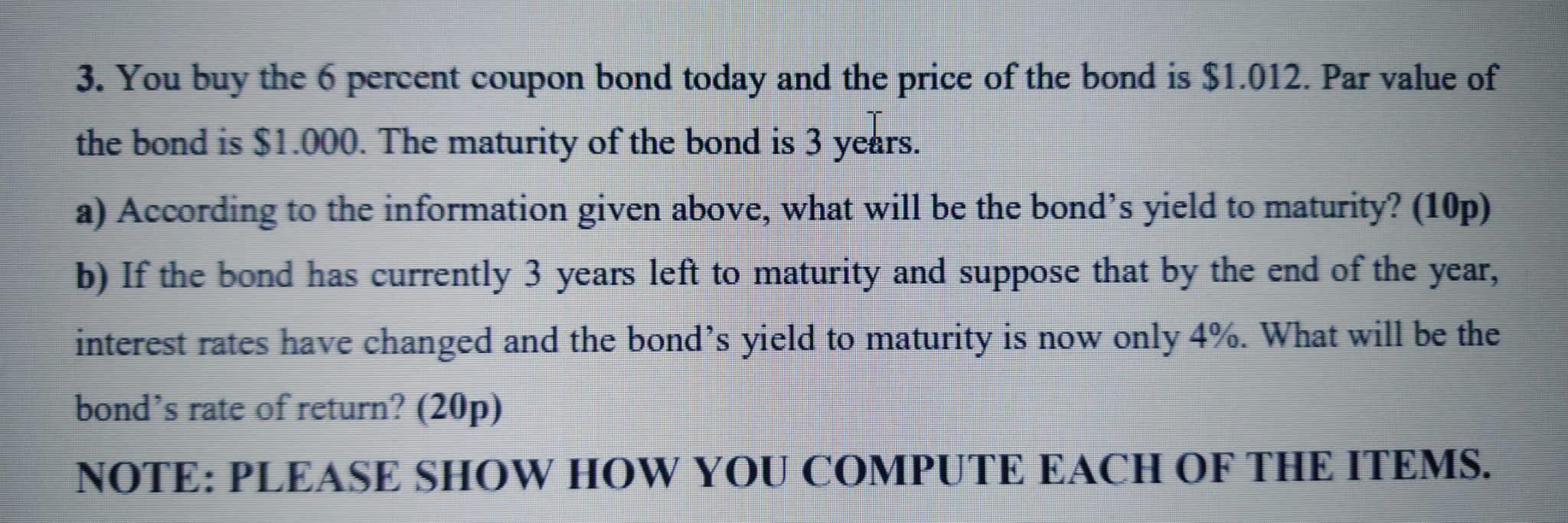 [Solved] A 10-year bond with a 9% annual coupon has a yield to maturity ... A 10-year bond with a 9% annual coupon has a yield to maturity of 8%. Which of the following statements is CORRECT? a. The bond is selling below its par value. b. The bond is selling at a discount. c. If the yield to maturity remains constant, the bond's price one year from now will be lower than its current price. d. Bond Price Calculator Let's assume that someone holds for a period of 10 years a bond with a face value of $100,000, with a coupon rate of 7% compounded semi-annually, while similar bonds on the market offer a rate of return of 6.5%. Let's figure out its correct price in case the holder would like to sell it: Bond price = $103,634.84