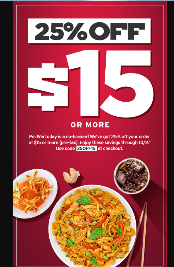 Pei Wei Coupons, Promo Codes and Deals 2022 - RetailMeNot.com Discounts average $7 off with a Pei Wei Asian Diner promo code or coupon. 4 Pei Wei Asian Diner coupons now on RetailMeNot. ... Get 1 Free Entree . Added by ...
