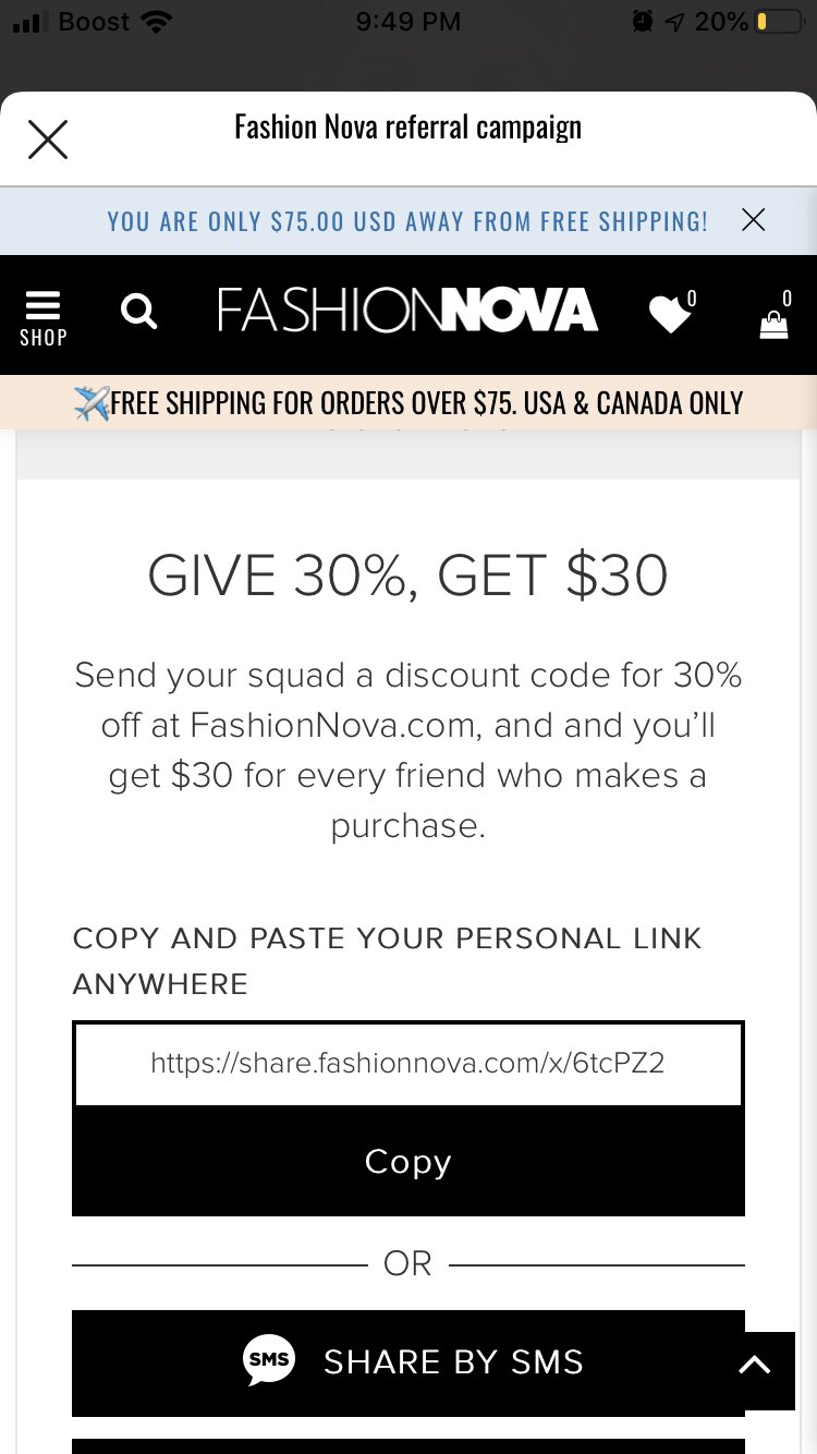 › view › fashionnova85% Off Fashion Nova Coupons, Promo Codes 2022 - RetailMeNot Fashion Nova Referrals Fashion Nova seems to think good friends share good fashions. Once customers have created an account on the site, they can refer friends and family for special promos. Referring one new customer earns the referrer a coupon for $30 off a purchase of $100 or more.