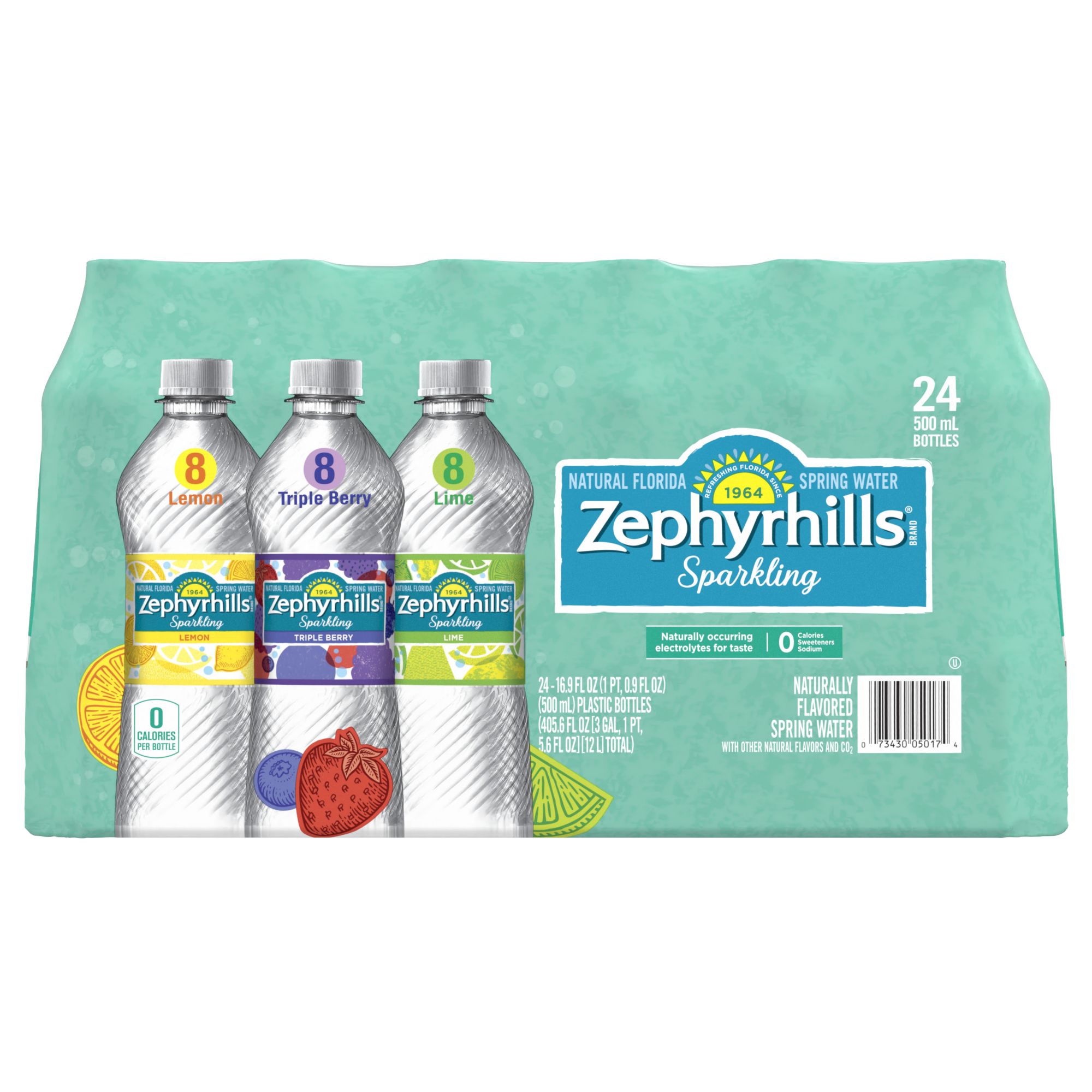 Zephyrhills Assorted Flavor Sparkling Natural Spring Water, 24 pk Description. Specifications. Made in USA. With carbonation and delicious fruit flavors, Zephyrhills 16 Oz. Assorted Flavor Sparkling Natural Spring Water offers a healthy alternative to sodas. It's made without any calories, sugar or artificial colors, relying on just 3 simple ingredients: natural spring water, natural fruit essence and bubbles.